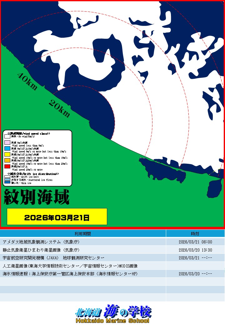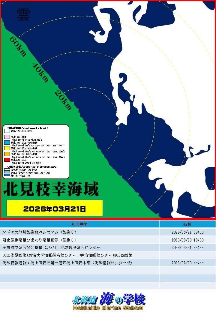 「海明け」は、沿岸に船舶が航行できる水路(流氷が無い開氷面)があり、枝幸方向あるいは網走方向に流氷分布が無い状態が形成された日。