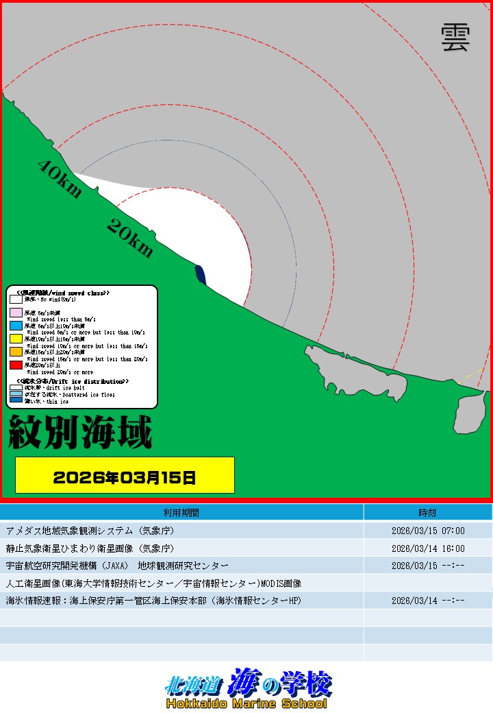 「海明け」は、沿岸に船舶が航行できる水路(流氷が無い開氷面)があり、枝幸方向あるいは網走方向に流氷分布が無い状態が形成された日。