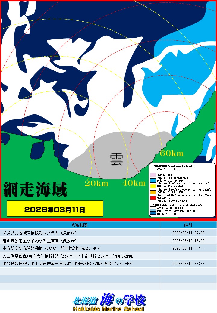 冬季(1~3月)の紋別公園における独自海氷観測・解析、沿岸の海氷分布図(北見枝幸、紋別市、網走・知床)作成、海上保安庁・海氷情報センタからの依頼で観測・情報提供を実施しています。近年、気象庁では海氷の目視観測を相次いで縮小、廃止しております。当団体では、海氷観測マニュアル(気象庁)にしたがった観測を紋別公園にて継続実施しています。2027年シーズンからは、オホーツク各沿岸に遠隔観測が可能な4K映像記録機器を整備し、情報ネットワーク構築を目指しています。